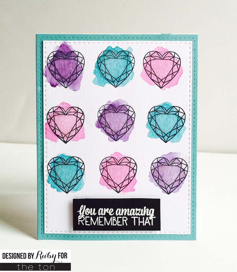 I started with some watercolor paper slightly smaller than size A2 and stamped the largest heart diamond outline with Ranger Archival black ink in rows. For the free watercoloring, I used the following Distress Inks: Dusty Concord, Peacock Feathers, and Picked Raspberry.